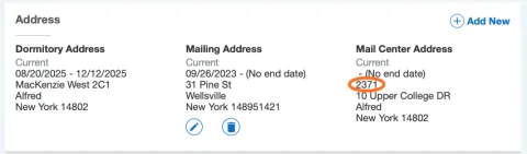 Students who live in campus housing pick up their incoming mail at the Mail Center (U.S. mail, UPS, FedEx, DHL, Amazon, etc.), Monday-Friday when school is in session. As packages are processed students receive an email, with tracking information, from mailroom@alfredstate.edu letting them know they have an item to pick up. If students are unable to come to the Mail Center during office hours they may respond to the email stating the name of the designee (trusted friend/roommate) authorized to retrieve their package.
