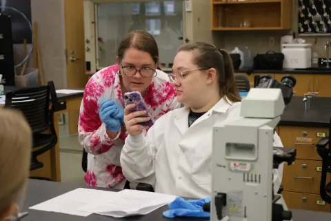 Nicole works with a student in a lab.