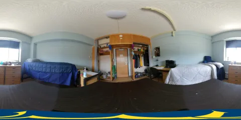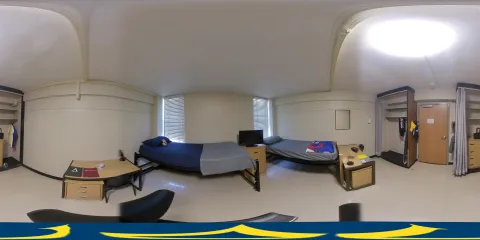 Tower-style residence halls located in MacKenzie West feature a small cluster of rooms locked behind a suite door. Each suite consists of three double rooms, one single room, and a shared common bathroom.